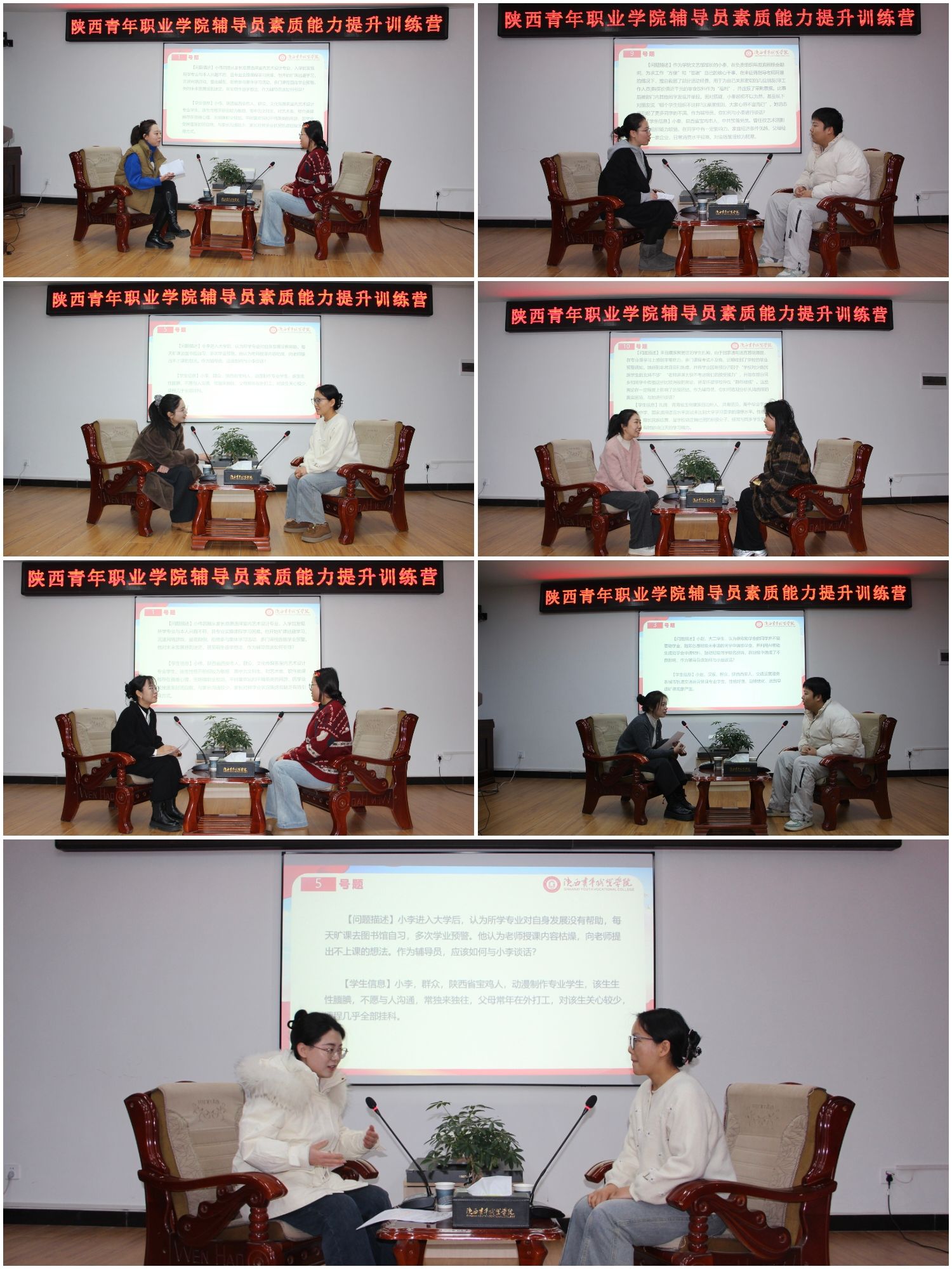 在本次训练营首设的“赋能分享”特色环节中,韩倩阐述了点亮学生心灯的感悟;任蕊介绍了叙事疗法在谈心谈话中的应用;李钰总结了征兵宣传工作的有效方法;郝芫颉讲解了职业生涯规划的具体流程与工具;贾小芬交流了少数民族学生工作的心得;王昕彤分享了引导学生平衡恋爱与学业的育人实践;胡艳艳探讨了大学生社会实践的组织经验;文化传媒系辅导员刘泽原分享了高压工作下情绪管理与能量补给的独到见解。在“案例分析”环节,7位选手现场抽题、限时作答,分析问题本质,提出思路措施。在“谈心谈话”环节,辅导员与学生现场互动,要求在十分钟内迅速把握问题核心,通过共情、引导、解惑展现沟通艺术与教育智慧。